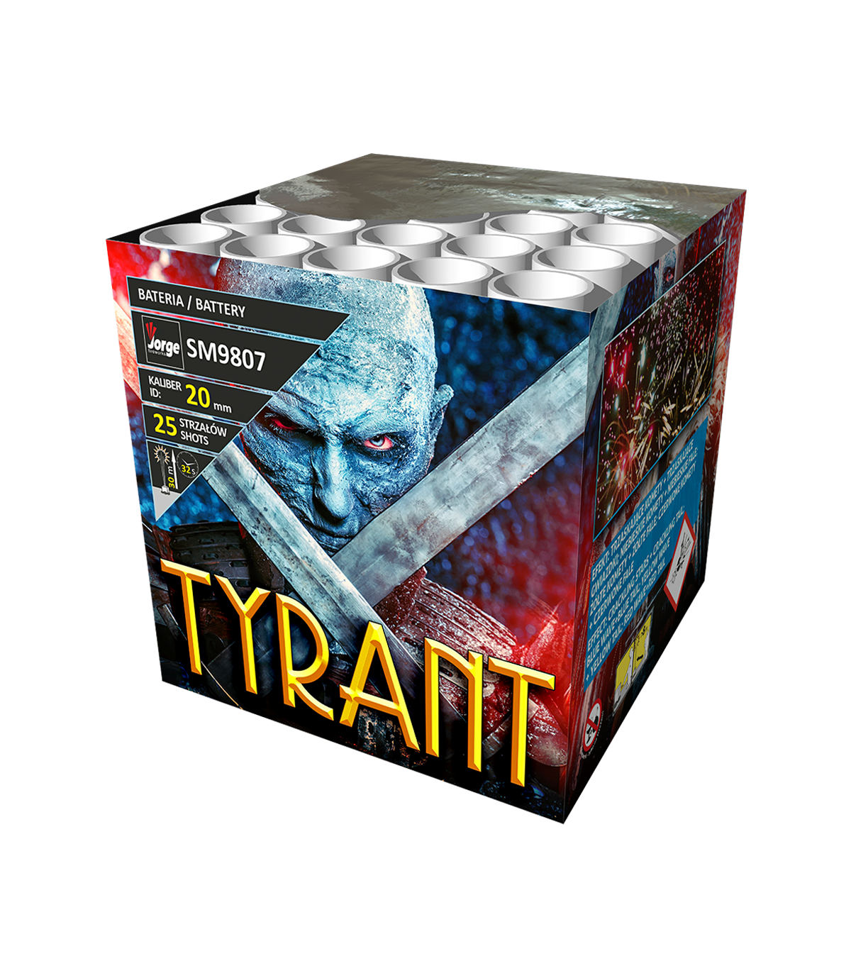 Batería pirotécnica Jorge Tyrant SM9807 con 25 disparos de 20 mm. Efectos coloridos con colas y estrellas; duración aproximada 32 s para celebraciones