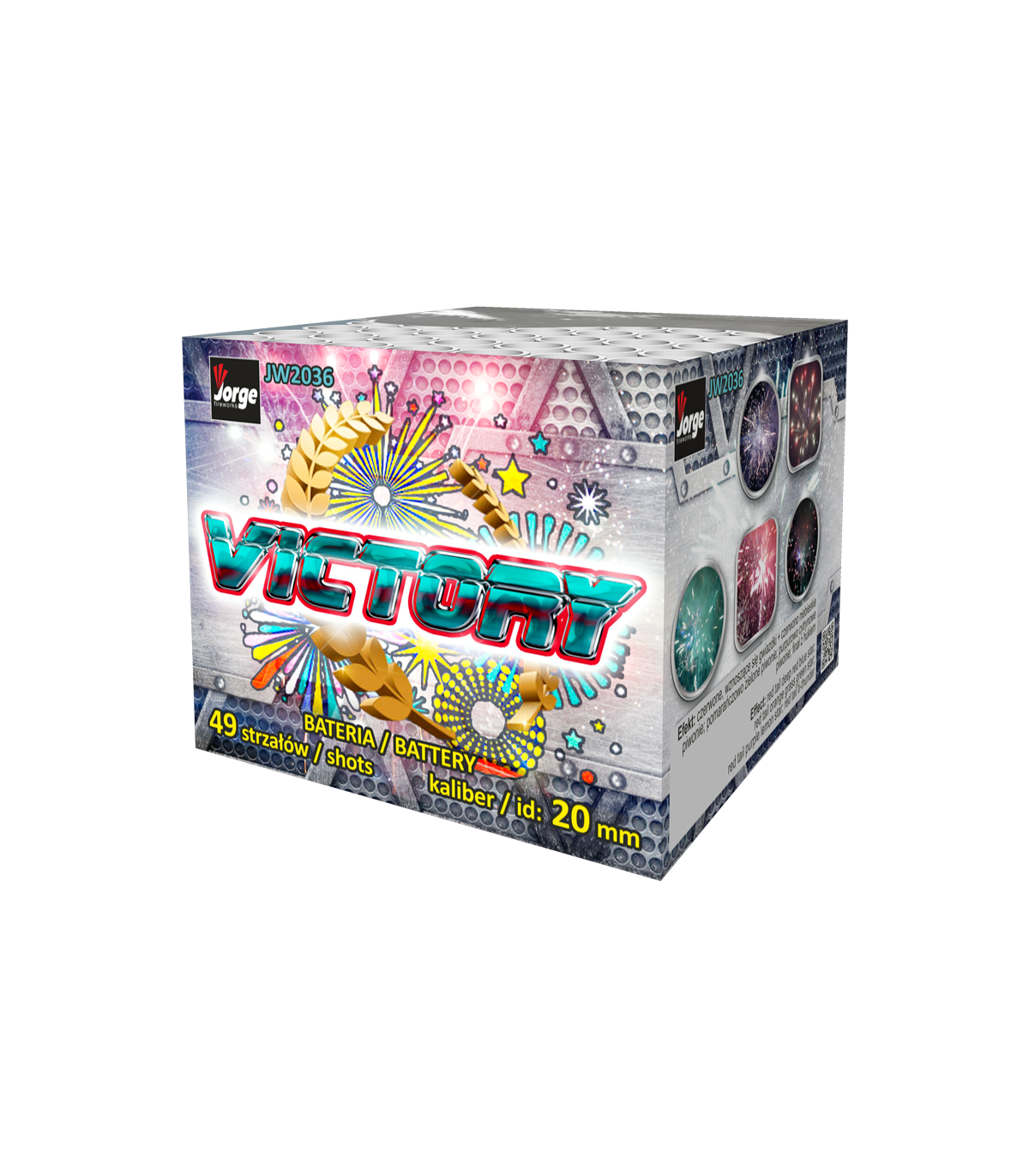 Batería pirotécnica Jorge Victory JW2036 con 49 disparos de calibre 20 mm y efectos de cola de color y estrellas multicolor. Duración aproximada de 30 segundos, perfecta para espectáculos y celebraciones.