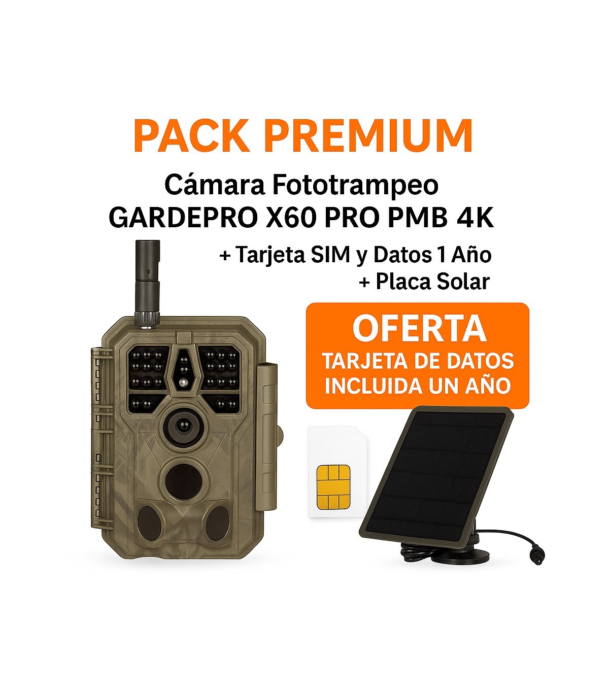El PACK PREMIUM GARDEPRO X60 PRO PMB lo incluye todo para que disfrutes de la mejor experiencia de fototrampeo, caza o seguridad exterior, sin preocuparte por nada: